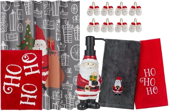 Celebrate the season with the Holiday Hills 6-Piece Christmas Bathroom Accessories Set, designed for a festive and cozy bathroom experience. This set includes a novelty soap dispenser, two soft hand towels with holiday motifs, a scented candle for a warm ambiance, a stylish vanity tray, and an adorable trinket tray. Each piece adds a touch of Christmas charm to your routine, making it a perfect gift or a delightful addition to bathroom décor. The soap dispenser provides practicality and holiday fun as it dispenses your favorite liquid soap with a festive flair. Two plush hand towels with charming holiday prints are super soft & machine washable. The scented candle enhances the cozy ambiance of your bath time into a peaceful escape from the hustle and bustle of the holiday season. The coordinating vanity & trinket tray are perfect for organizing while infusing a dash of Christmas charm into your daily routine. Available in three charming holiday designs to match any style. Each piece in the Holiday Hills 6-Piece Christmas Bathroom Accessories Set reflects the spirit of the season, making it an ideal gift or a delightful addition to your holiday festivities. Immerse yourself in the celebration of Christmas with this cheerful bath set.